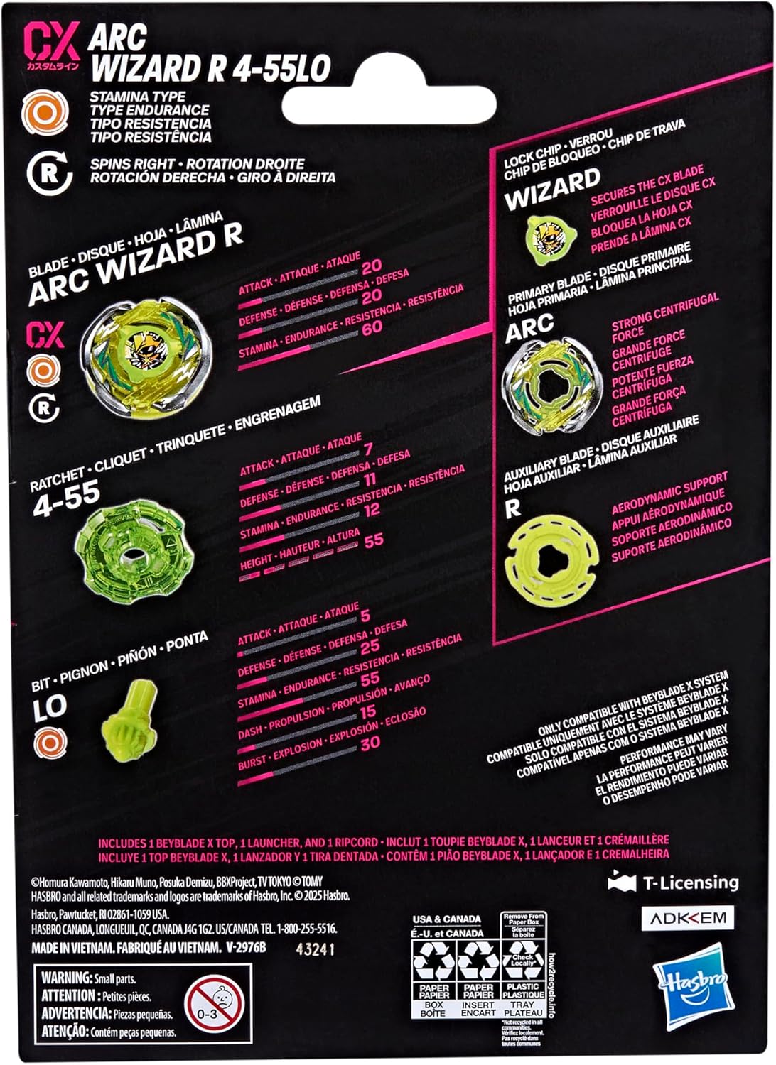 Experience the thrill of Beyblade X, the next generation of Beyblade stadiums, launchers, and tops! The Beyblade X Arc Wizard R 4-55LO CX Starter Pack includes a launcher and 1 right-spinning Stamina Type top with an Stamina Type Blade (Beystadium required, sold separately). Launch right into battle or reconfigure the top by switching the interchangeable blade, ratchet, and bit with those of other Beyblade X tops (sold separately) to create your own unsurpassable top. CX tops are designed with a blade that separates into 3 pieces for expanded customizing options! Beyblade X features the X-Celerator Gear System: the gear of a Beyblade X top engages the rail of the Beystadium arena, super-accelerating the top into an Xtreme Dash around the stadium for crushing collisions and epic bursts. Launch your tops into fierce clashes against opponents’ tops, scoring points with each confrontation. Hasbro Beyblade toys with authentic Takara Tomy die-cast metal tops make great gifts for kids ages 8 and up. HASBRO and all related trademarks and logos are trademarks of Hasbro, Inc.