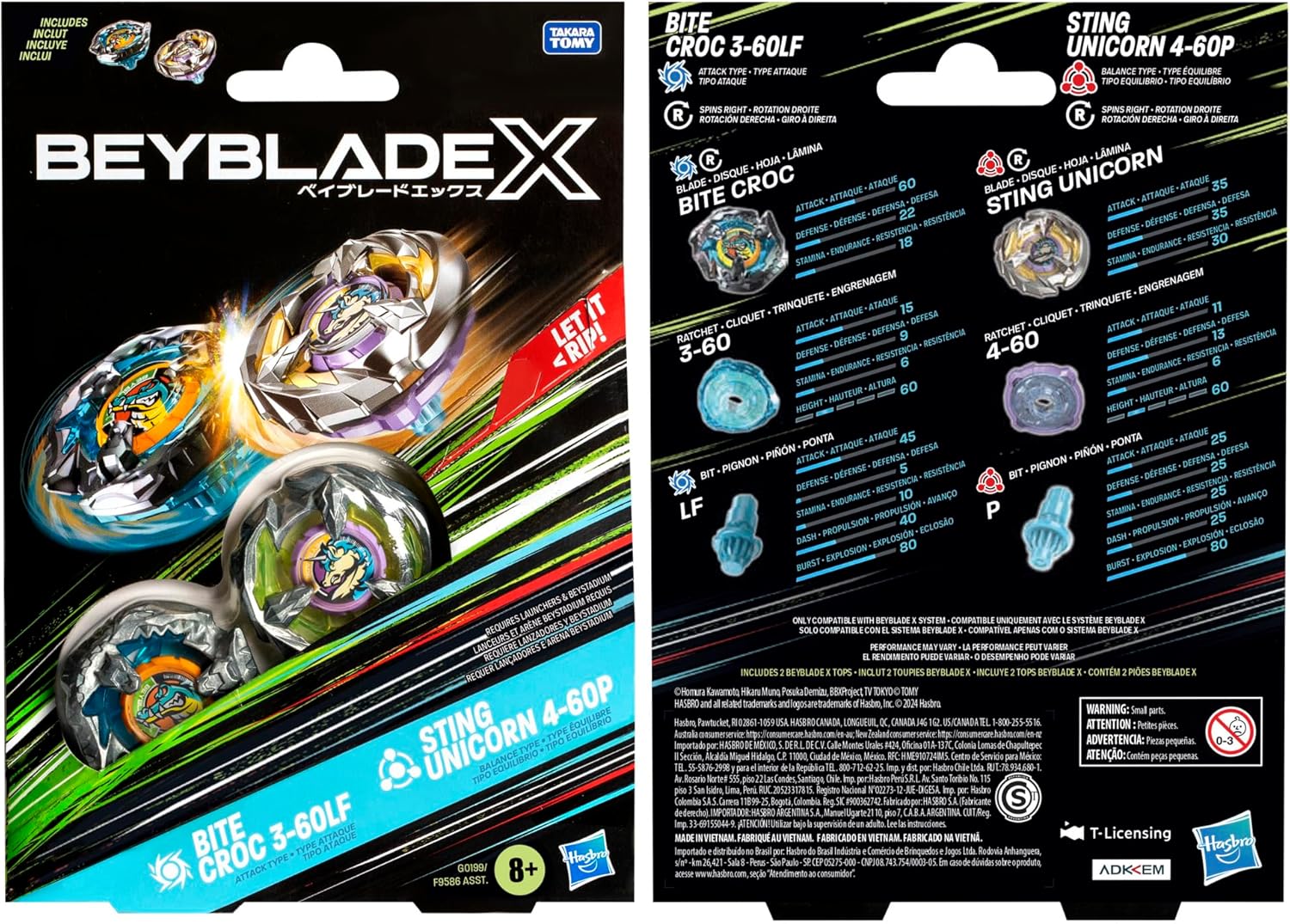 Experience the thrill of the next generation of Beyblade stadiums, launchers and tops: Beyblade X with the Beyblade X Bite Croc 3-60LF and Sting Unicorn 4-60P Dual Pack Set which includes 2 right-spinning tops (Beystadium and launchers required, sold separately). Launch right into battle or reconfigure the interchangeable blade, ratchet, and bit of this Dual Pack with those of other Beyblade X tops (sold separately) to create your own unsurpassable Bey. Beyblade X features the X-Celerator Gear System innovation to level-up your game. When the gear of a Beyblade X top engages the rail of the Beystadium arena, it can super-accelerate into an Xtreme Dash rocketing it around the stadium for crushing collisions and epic bursts. Bladers launch their tops into fierce clashes against their opponent’s scoring points with each confrontation – first to score 4 points wins. Hasbro Beyblade toys with authentic Takara Tomy die-cast metal tops make great kids gifts for boys and girls ages 8 and up. HASBRO and all related trademarks and logos are trademarks of Hasbro, Inc.