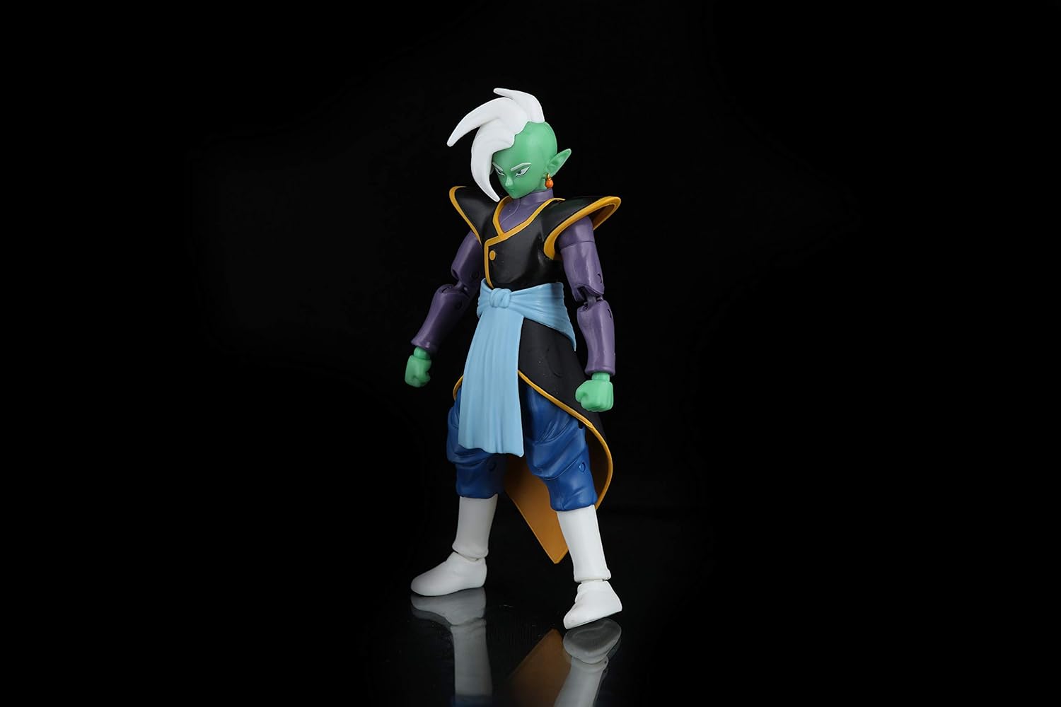 From the Dragon Ball Stars Wave 4 comes this Zamasu action figure that is highly detailed and articulated. Standing at 6 1/2-inches tall with over 16 points of articulation and additional hands, Zamasu can be posed in hundreds of positions. The figure comes packaged with an exclusive collectible piece that can be combined to form the Fusion Zamasu!