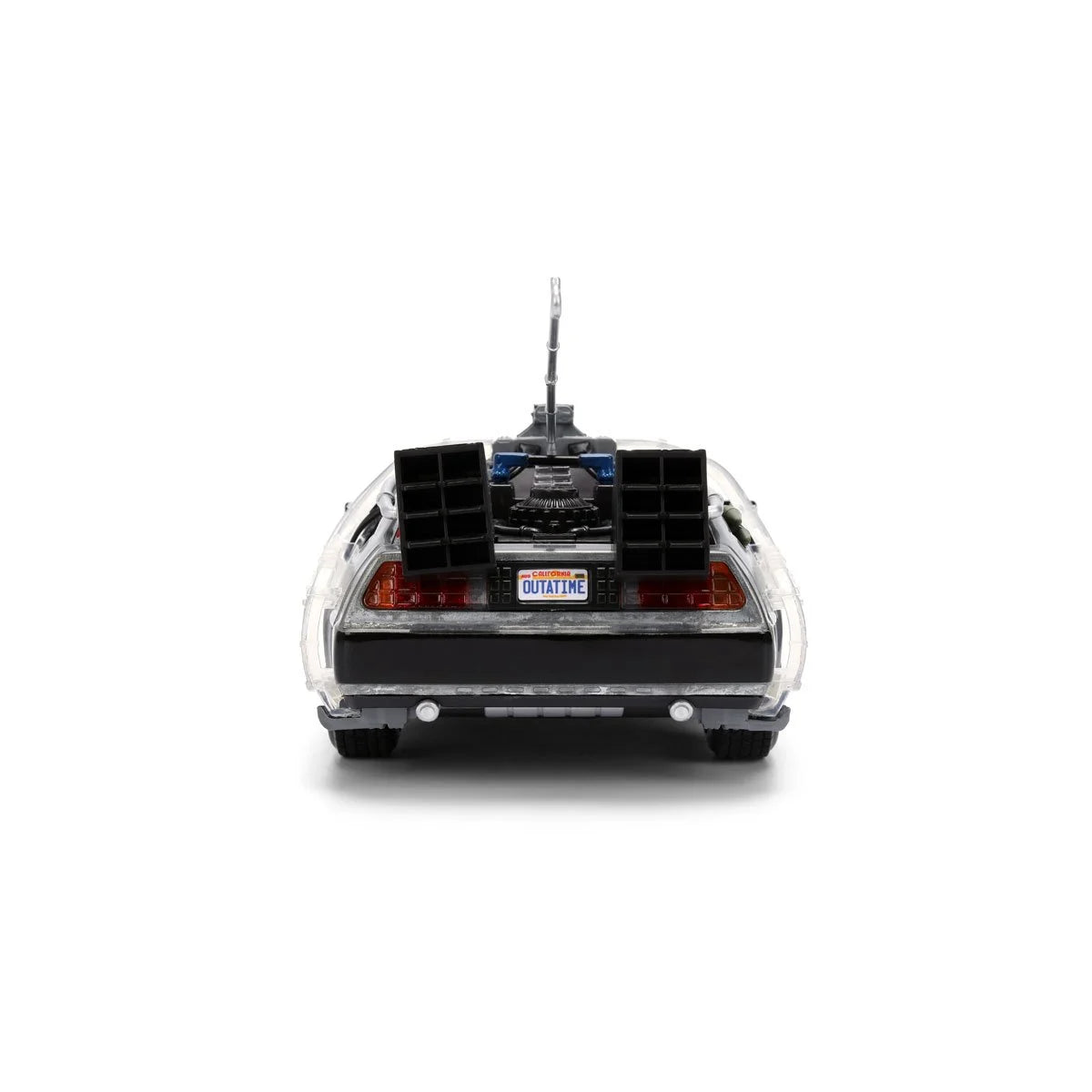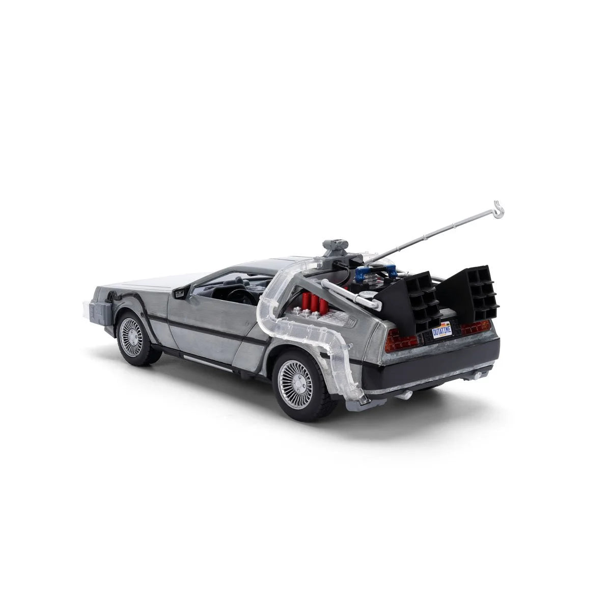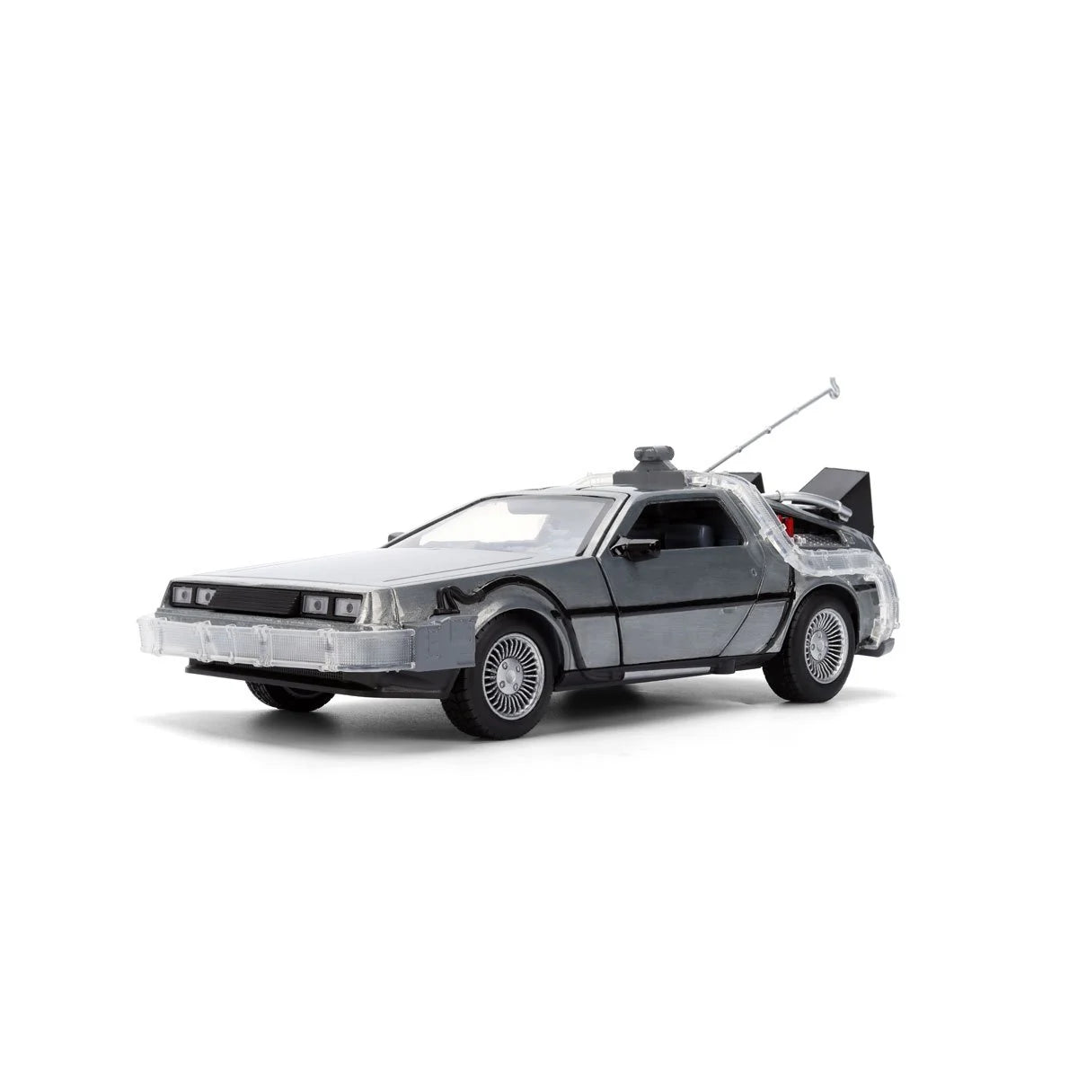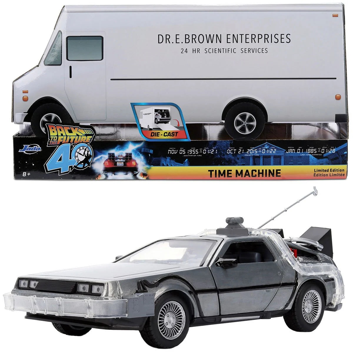 Step into cinematic history with the Back to the Future 40th Anniversary Time Machine by Jada Toys. This 1:24 scale die-cast vehicle captures the legendary Time Machine in brushed silver styling, reflecting its look from the original film. With precision detailing, rolling wheels, and opening features, it's built to be displayed, admired, or gently played with. What sets this edition apart is its packaging-styled as Dr. E. Brown's "24 HR Scientific Services" truck. While not a separate toy, the truck-shaped display box recreates the unforgettable scene where the Time Machine makes its dramatic debut. A must-have for collectors and fans-secure this limited edition Hollywood Rides Back to the Future Time Machine 40th Anniversary 1:24 Scale Die-Cast Metal Vehicle before it vanishes!