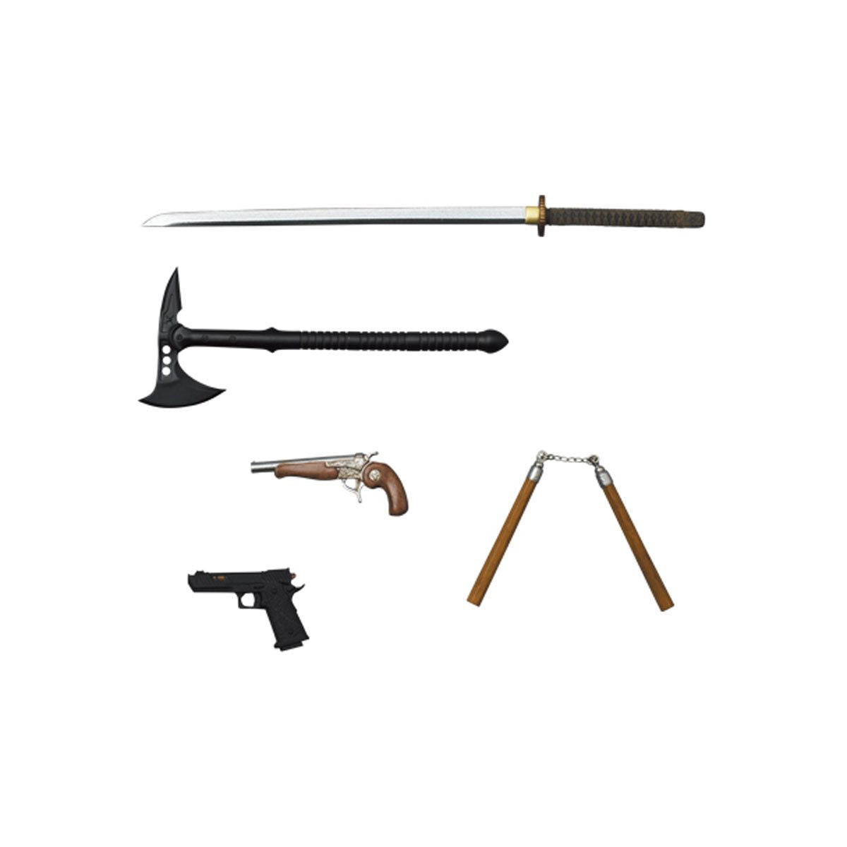 From John Wick: Chapter 4 comes the legendary assassin! Standing approximately 6 1/3-inches tall, this action figure perfectly captures the essence of the iconic protagonist portrayed by Keanu Reeves. It features 2x interchangeable head parts, an additional upper body part without the jacket, katana, axe, nunchaku, pistol, flintlock pistol, and a poseable stand. The John Wick: Chapter 4 John Wick MAFEX Action Figure combines exceptional design and articulation for an ultimate addition to your collection! For ages 15 and up.