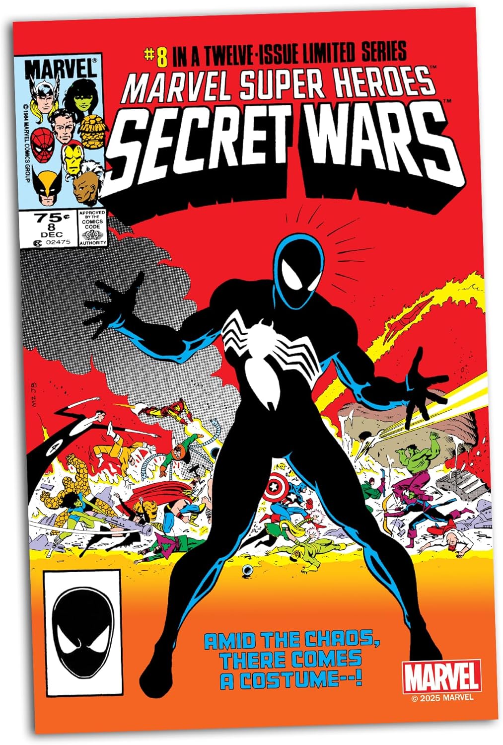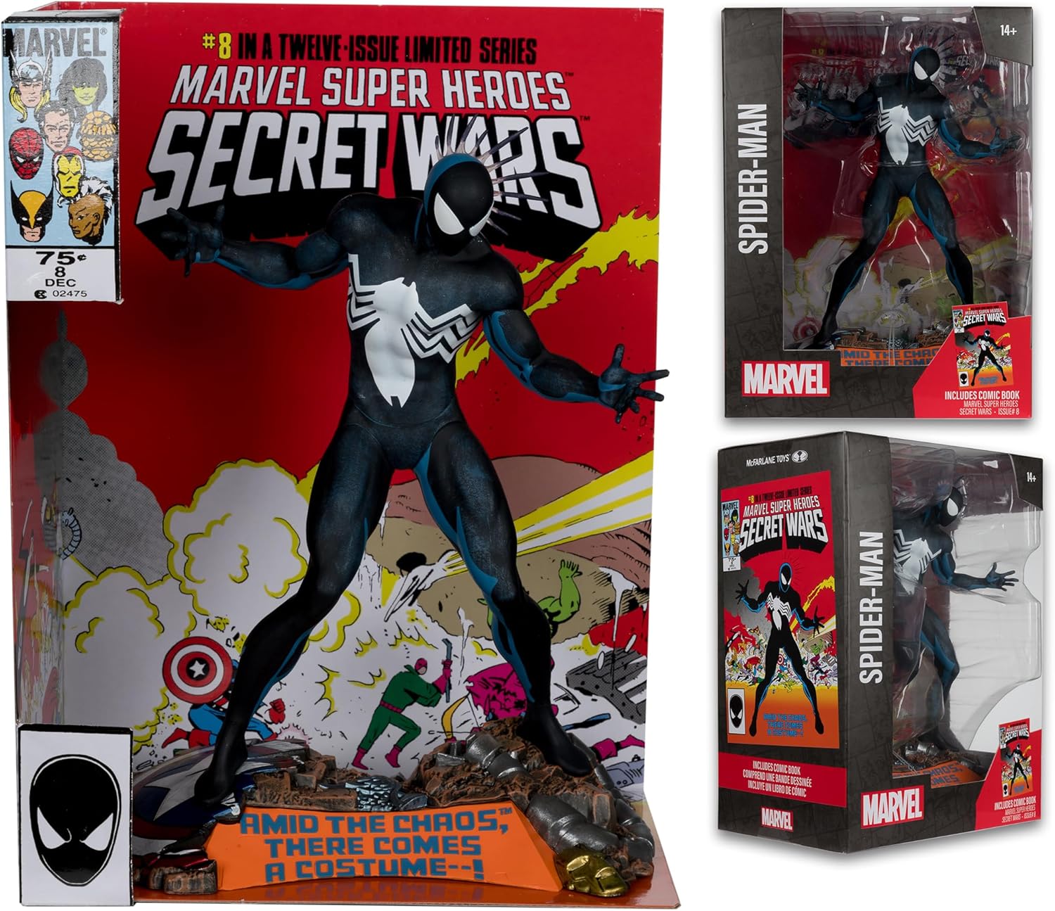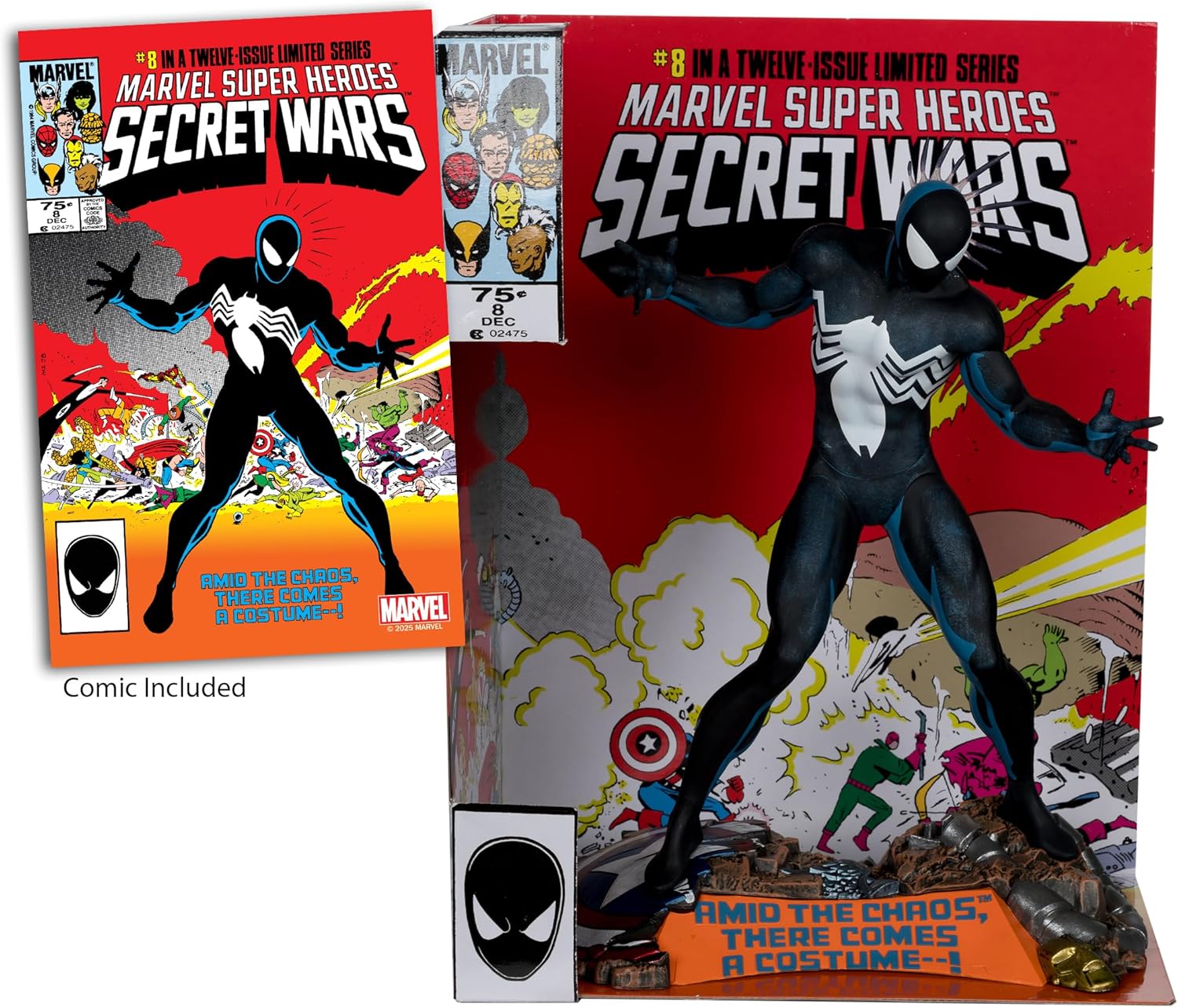 As awesome and striking as Spider-Man's new black costume is, you can't help but stare at the crazy super-brawl taking place behind Spidey. Includes comic book and an art card with character artwork on the front, and comic synopsis.