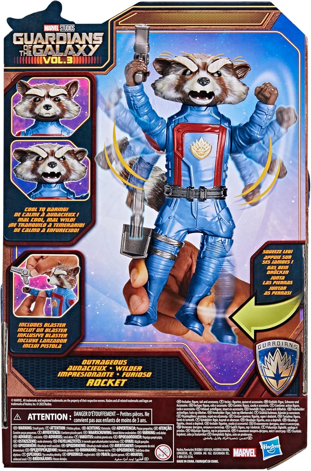 Kids ages 4 and up will love creating awesome space adventures with this Marvel’s Rocket Outrageous Rocket Action Figure. This 8-inch-scale action figure includes a blaster accessory and a tail so that kids can imagine themselves as Marvel’s Rocket, blasting away enemies and protecting the Guardians. Squeeze the legs for a feisty facial expression transformation and see Marvel’s Rocket go from cool to daring as he prepares for galactic battles in space. With updated suits and accessories inspired by Guardians of the Galaxy Vol. 3, kids will love recreating their favorite space battles and moments from the movie. Copyright 2023 Marvel. Hasbro and all related terms are trademarks of Hasbro.