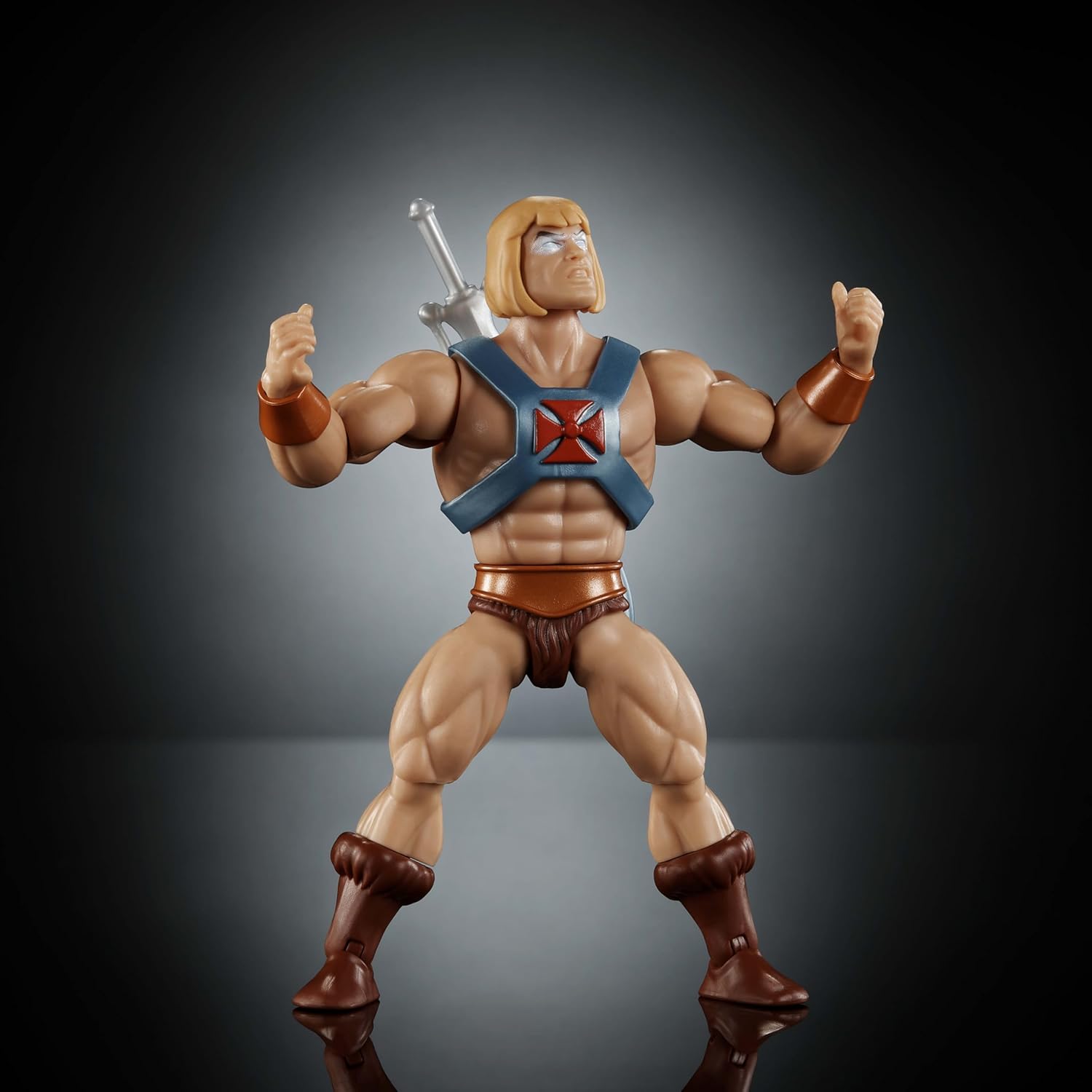 This Masters of the Universe Origins Faker action figure from the Cartoon Collection is inspired by the original He-Man and the Masters of the Universe TV series from the '80s. The He-Man imitator is designed with a vintage look at 5.5-inch scale, but with the modern posability of 16 movable joints. This MOTU toy Faker is inspired by the "The Shaping Staff" episode and has glowing eyes and a Power Sword accessory. This figure also comes with a removable harness and an alternate head and a mini-comic is included for story context. Makes a great gift for Masters of the Universe fans 6 years and older. Colors and decorations may vary.
