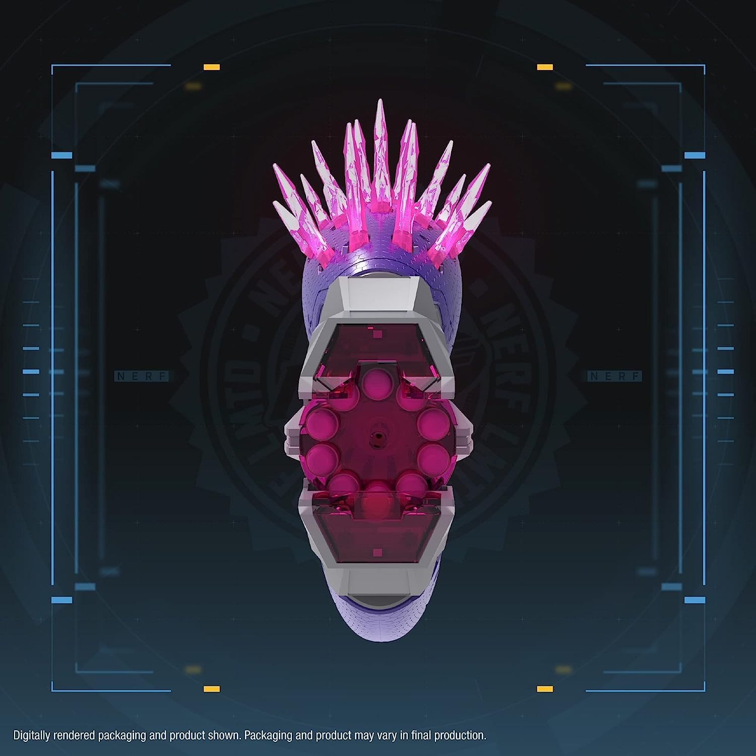 The Nerf LMTD Halo Needler blaster captures the look of the blaster from the Halo video game franchise! Imagine yourself as one of the Banished or Covenant and get ready to battle the UNSC! This Nerf dart blaster recreates the blaster's distinctive design with flexible needles that light up when you grip the handle! Fire the darts and watch the needles go dark to simulate how they launch from the blaster in the game. Other light-up accents add to the exciting visual presentation. This fully motorized blaster unleashes 10 darts in a row from the rotating, 10-dart drum. Includes 10 Nerf Elite foam darts. Switch to display mode to illuminate the blaster and showcase it on the included stand. Includes a game card with in-game content in the Halo Infinite game.* Eyewear recommended (not included). Requires 6x AA 1.5v alkaline batteries (not included).