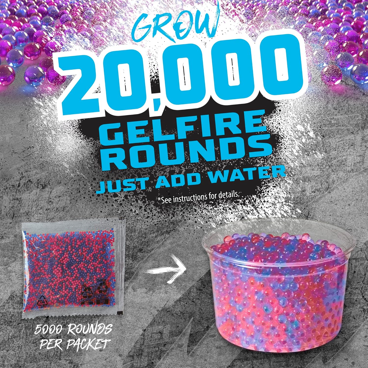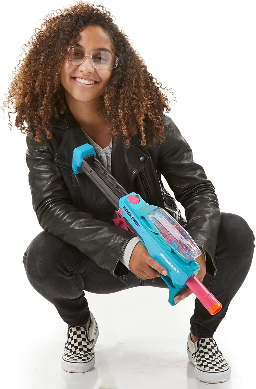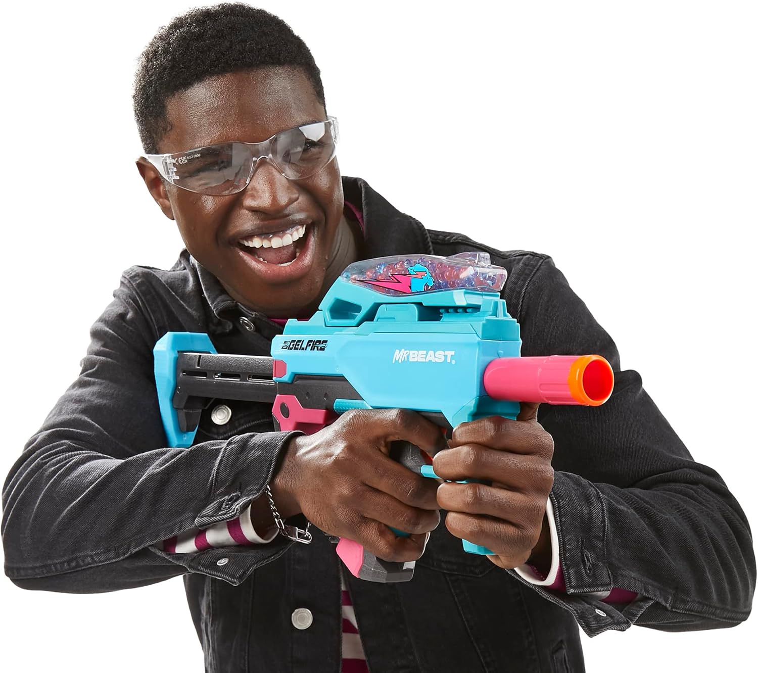 Nerf Pro Gelfire blasters feature hydrated rounds that burst on impact, have massive capacity, and deliver high-performance blasting. The Nerf Pro Gelfire X MrBeast fully automatic blaster is a collaboration with Jimmy "MrBeast" Donaldson, an American digital creator who has amassed over 100 million subscribers in the last 10 years and become an icon among younger generations around the world. Nerf Pro Gelfire rounds come dehydrated in the box to give you a huge amount. Add water to hydrate them for use. Hydrated rounds fire at a high velocity and burst when they hit a target. No need to pick up rounds! Includes blaster with full- and semi-auto modes, 300-capacity hopper, 20,000 dehydrated Nerf Pro Gelfire soft super absorbent polymer projectiles, removable barrel, extendable stock, protective eyewear, easy slide-in slide-out rechargeable battery, and universal USB-A to USB-C charging cable. Requires USB-A wall charger, not included. Outdoor use recommended. For ages 14 and up. MRBEAST and the Beast Logo are trademarks of Beast Holdings, LLC, Greenville, NC 27858. Hasbro and all related terms are trademarks of Hasbro.