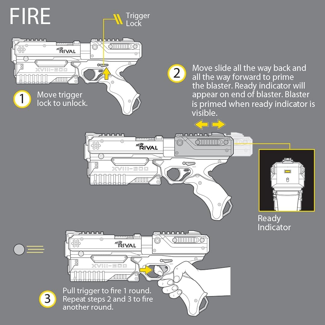 Make a powerful impression on the battlefied with this Nerf Rival Kronos XVIII-500 blaster that features an Amazon exclusive white color design! Take on opponents with the spring-action Nerf Rival Kronos XVIII-500 blaster that fires rounds at a velocity of 90 feet per second. Easy loading: Open the breech to load 5 high-impact rounds, prime it with the spring-action mechanism, and pull the trigger to unleash 1 round (no batteries required). A trigger lock prevents the blaster from being fired accidentally. The ready indicator shows when the blaster is fully primed. Tactical rail lets you customize the blaster with Nerf Rival gear and accessories (each sold separately). Includes 5 Official Nerf Rival rounds. Experience the intensity of Nerf Rival battles with this Amazon exclusive Kronos XVIII-500 blaster! Nerf and all related properties are trademarks of Hasbro.