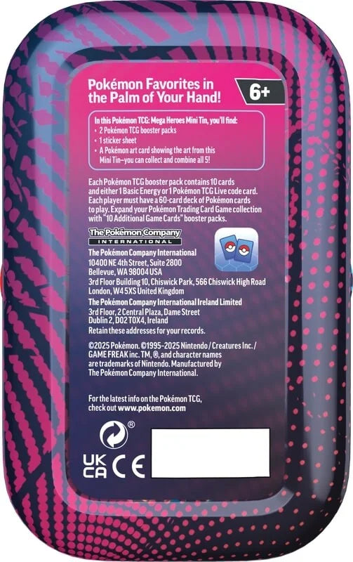 This 10-tin display includes a full set of unique designs, making it an ideal pickup for fans who want to collect them all or share the fun with friends. Compact, stylish, and filled with surprises, the Mega Heroes Mini Tins are perfect for storing your favorite cards or displaying your Pokémon pride.