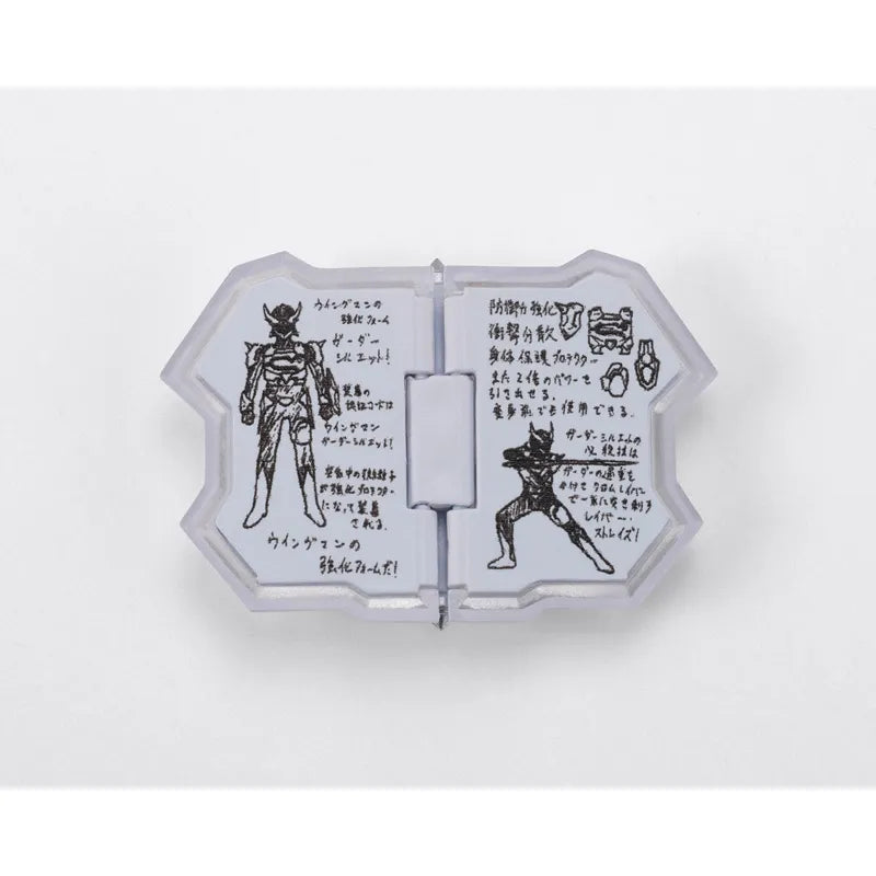 The “Drim Pen” attached to the spine of the notebook is sculpted in its completed form, equipped with the “Dream Eraser”, differing from the version included with S.H.Figuarts (Shinkocchou Seihou) Wingman (sold separately). The pen can also be detached from the notebook, and when paired with the included interchangeable hand parts, you can recreate scenes of Wingman sketching out ideas for his finishing moves.