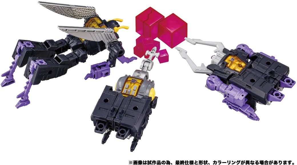 Skywarp is a member of the Decepticon air force, the Seekers, and is an airman who transforms into a jet plane. Kickback, Sharpnel, and Pumpshell are members of the independent Insecticon unit, and are feared for their cunning and greedy natures. They transform into a grasshopper, a stag beetle, and a rhinoceros beetle, respectively.