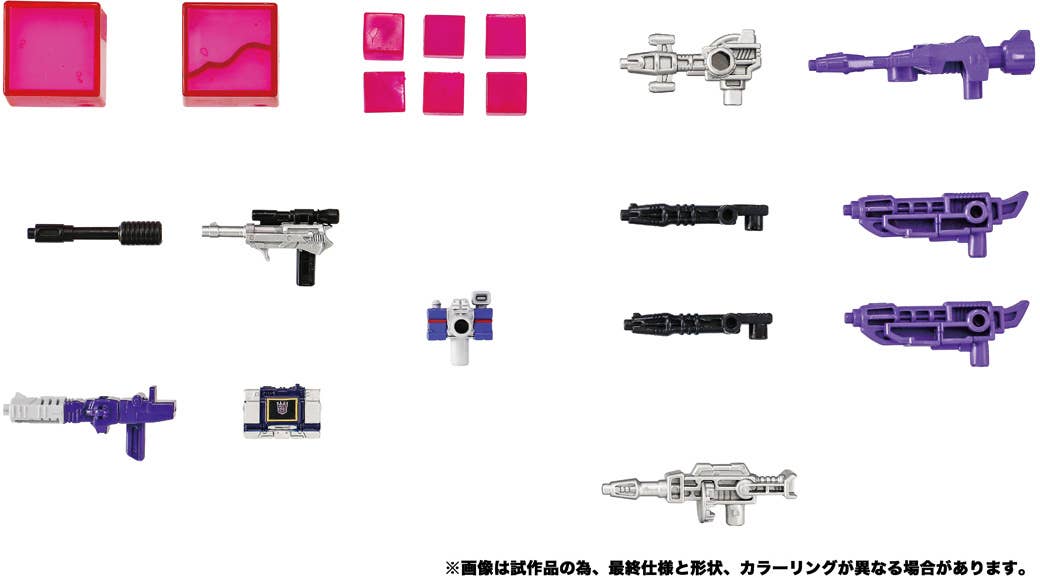 In addition to various weapons, the set also includes small accessories that recreate the iconic alt modes of Megatron, Shockwave, Soundwave, and Reflector from the film.