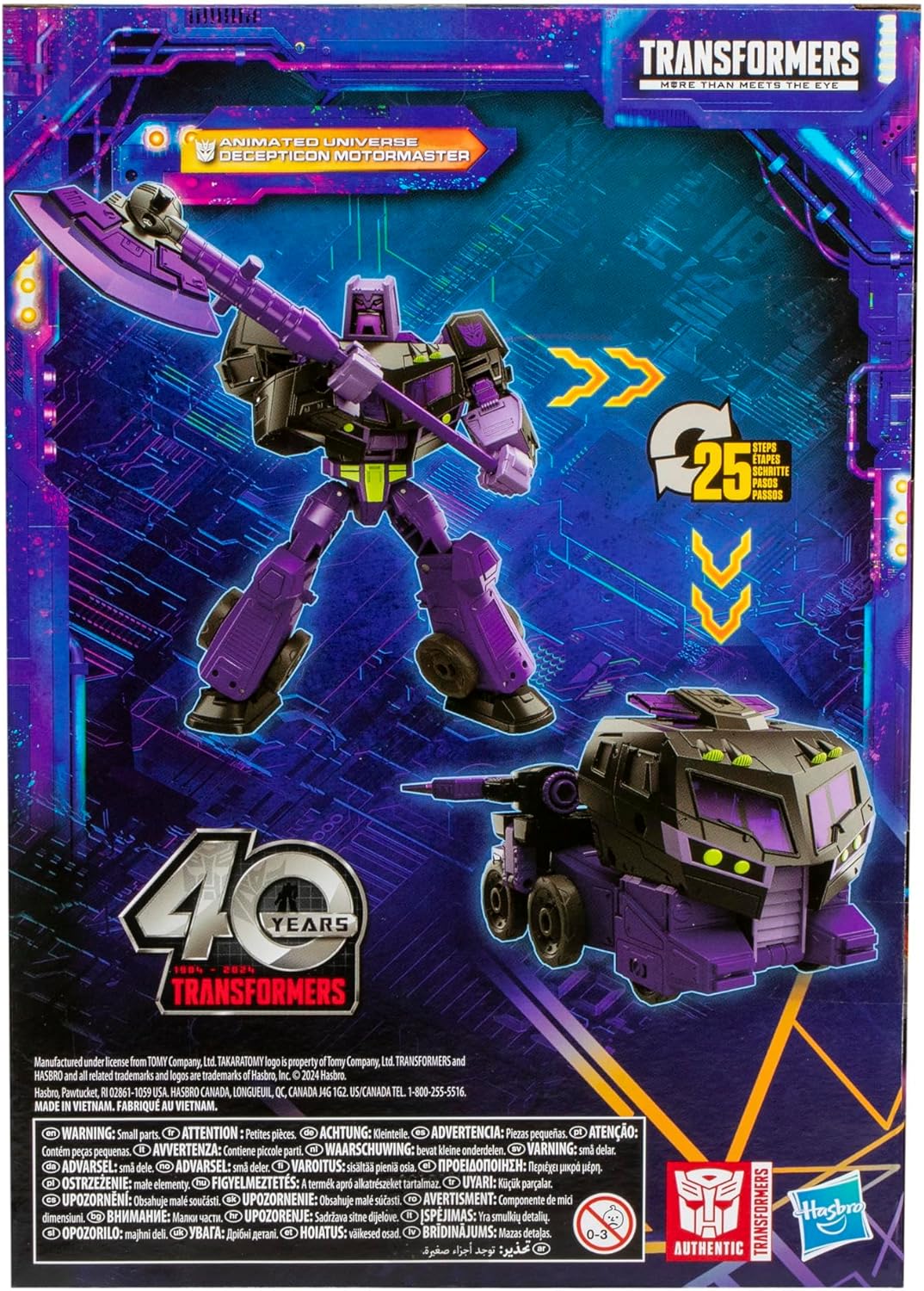 Unite your favorite characters from across the world of Transformers robots into your collection with the Transformers Legacy United Voyager Class Transformers: Animated Universe Decepticon Motormaster action figure! This 7-inch Animated Universe Decepticon Motormaster action figure converts between robot and truck modes in 25 steps. Gear up for battle with the included axe accessory. The Transformers: Animated Universe Decepticon Motormaster figure is inspired by the character from the Transformers: Animated series and features articulated head, arms, and legs for awesome action poses. Celebrate the last 40 years of Transformers history with Transformers Legacy action figures. Transformers Legacy opens the portal to a whole new universe of -- More Than Meets the Eye -- bringing together every Transformers generation like you’ve never seen before. Collect and combine different characters to create your ideal Legacy lineup. TRANSFORMERS and HASBRO and all related trademarks and logos are trademarks of Hasbro, Inc. © 2024 Hasbro.